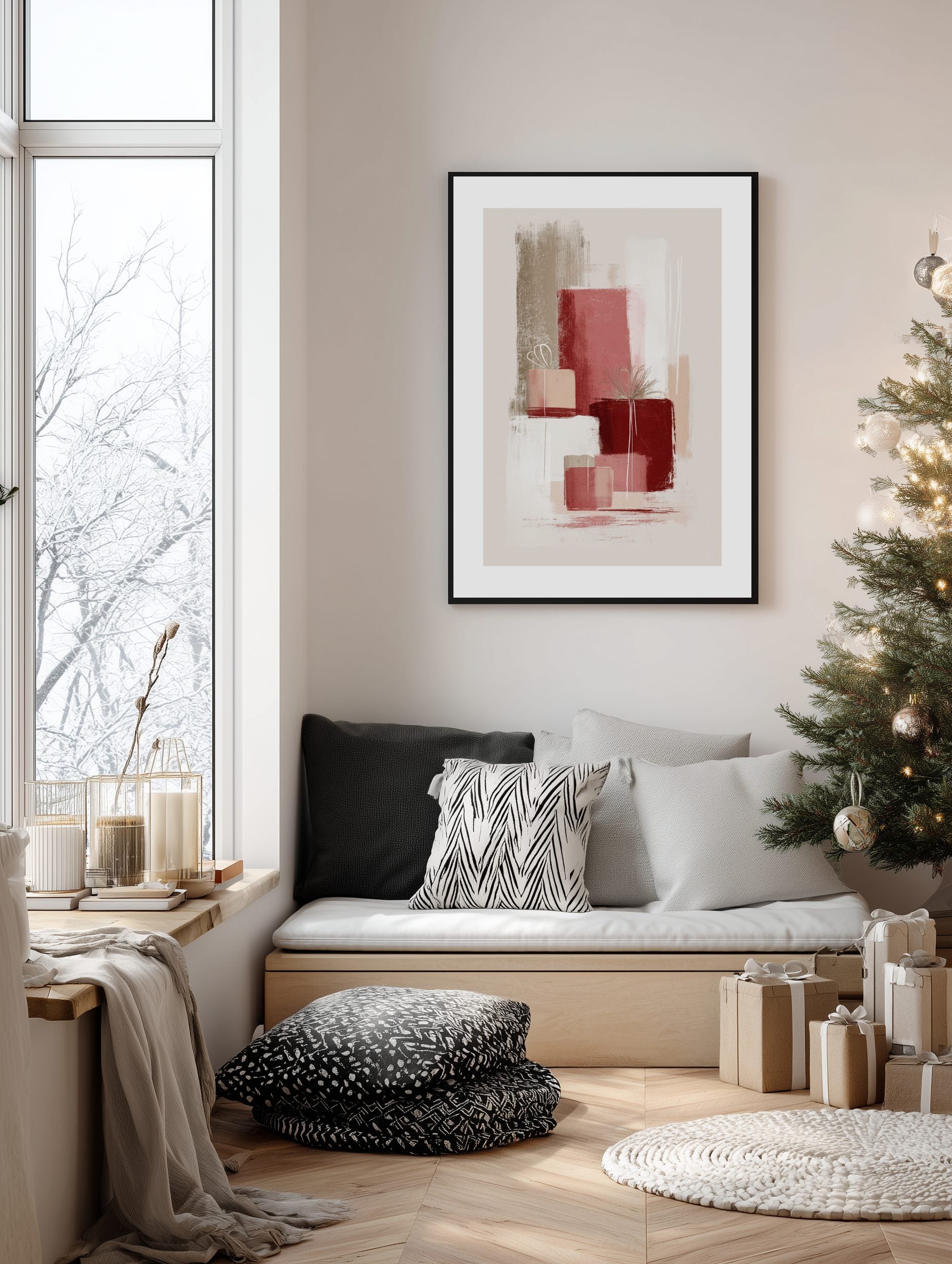 Ett minimalistiskt abstrakt julkonstverk med röda och beige toner inspirerade av inslagna presenter och festliga texturer. Perfekt för moderna inredningar med en skandinavisk touch.
