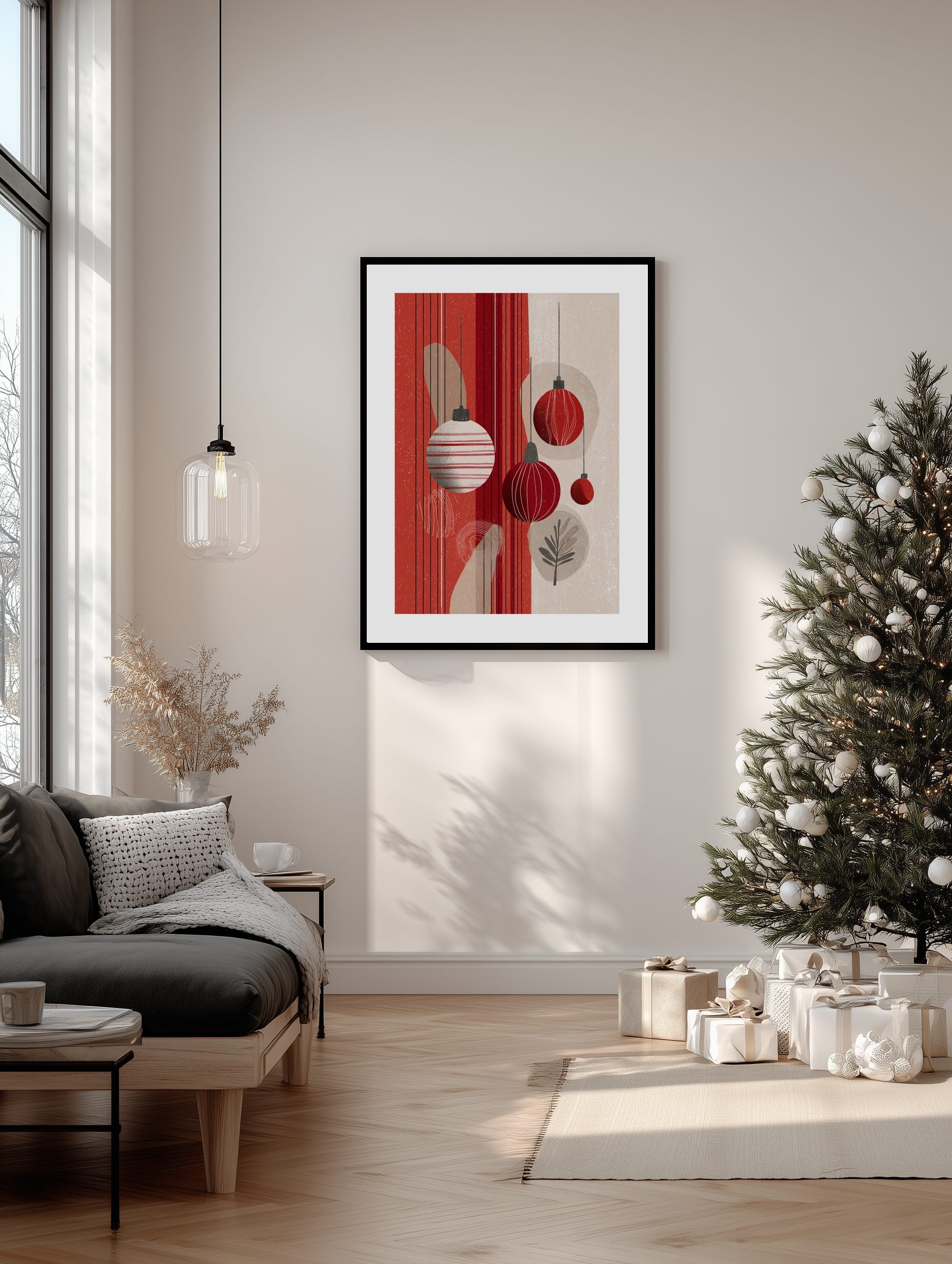 En minimalistisk abstrakt poster med röda och beige julgranskulor i en ren skandinavisk design. Perfekt för att ge din heminredning en subtil festlig charm och modern elegans.