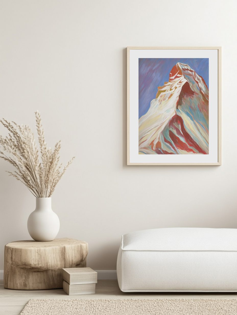 Ett högt berg målat i uttrycksfulla pastellfärger av rött, blått och krämfärgat – djärvt och inspirerande för alla moderna utrymmen.