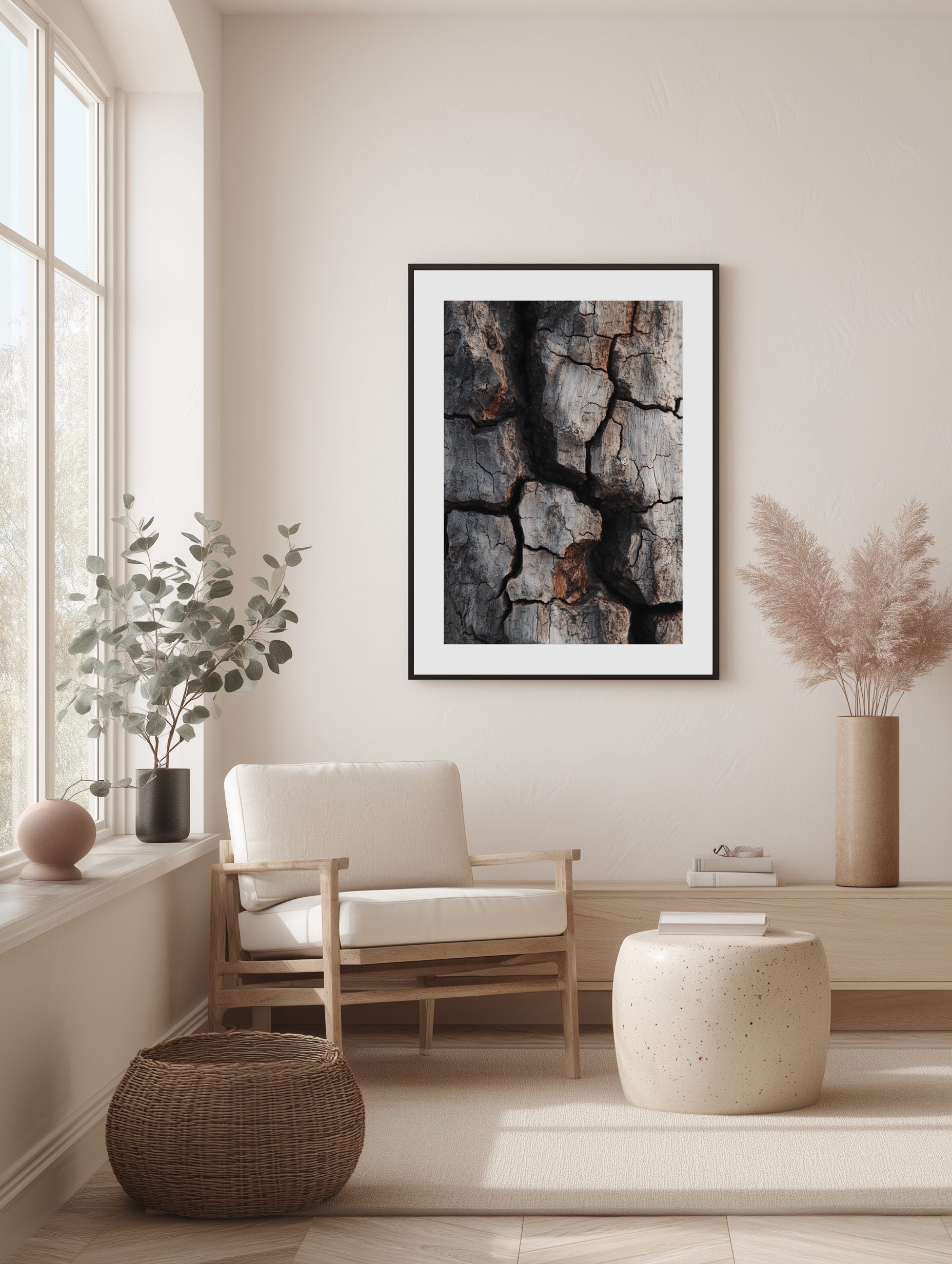 Ett dramatiskt makrofotografi av mörk, sprucken bark med varma, jordiga detaljer. Denna texturerade naturposter skapar kontrast och djup i skandinaviskt inspirerade utrymmen.