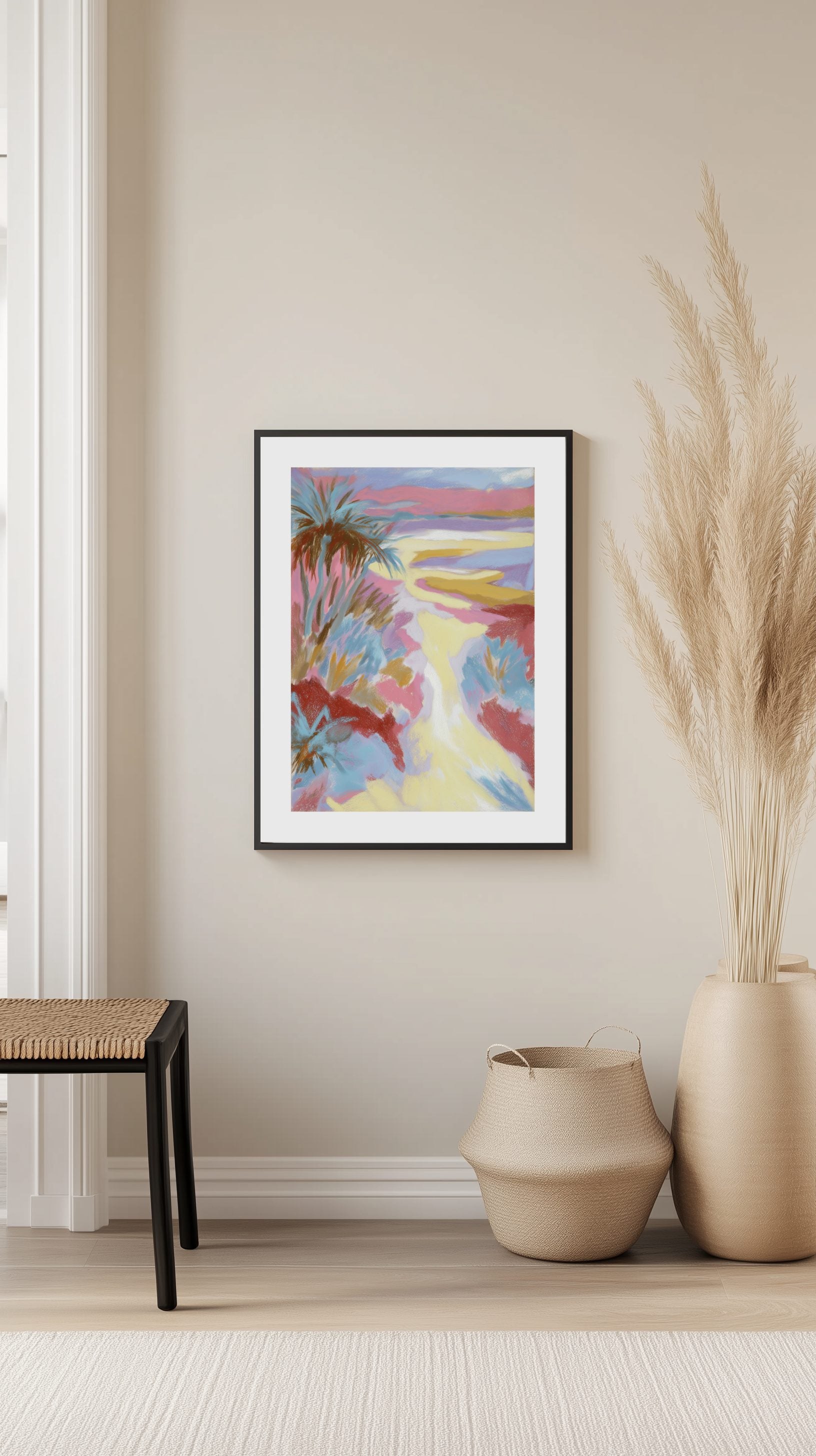 Få in charmen av en drömlik tropisk tillflykt i ditt hem. Denna pastellfärgade poster föreställer en slingrande sandstig som leder till en lugn strand, inramad av palmer och livfull flora. Perfekt för att skapa en avslappnad och exotisk atmosfär.
