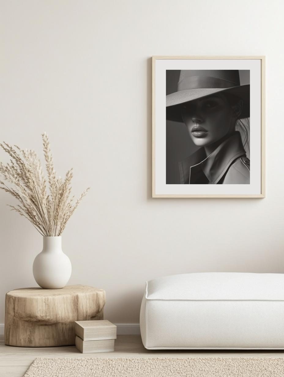 Ett filmiskt svartvitt porträtt av en kvinna i bredbrättad hatt och trenchcoat. Perfekt för modeinspirerade inredningar.