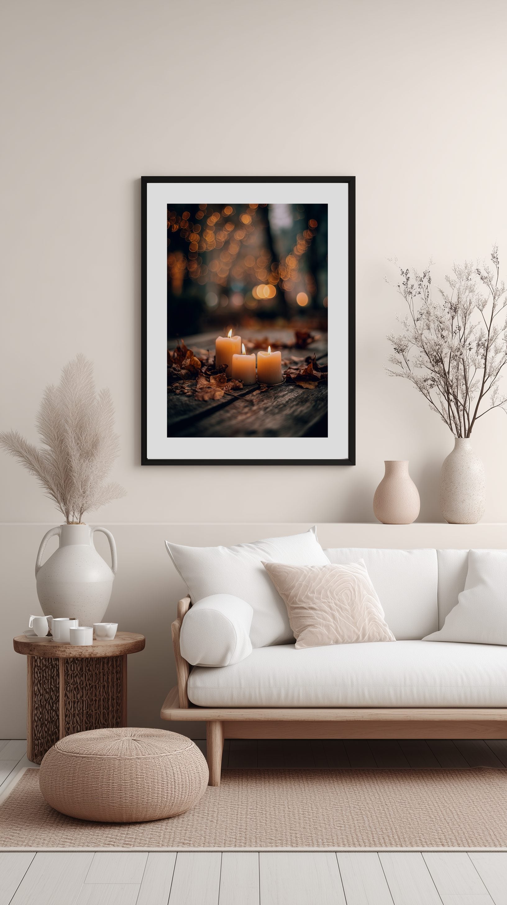 Denna mysiga poster föreställer ett kluster av lysande ljus på ett rustikt träbord med höstlöv. Den perfekta väggkonsten för att ge värme till ditt vardagsrum.