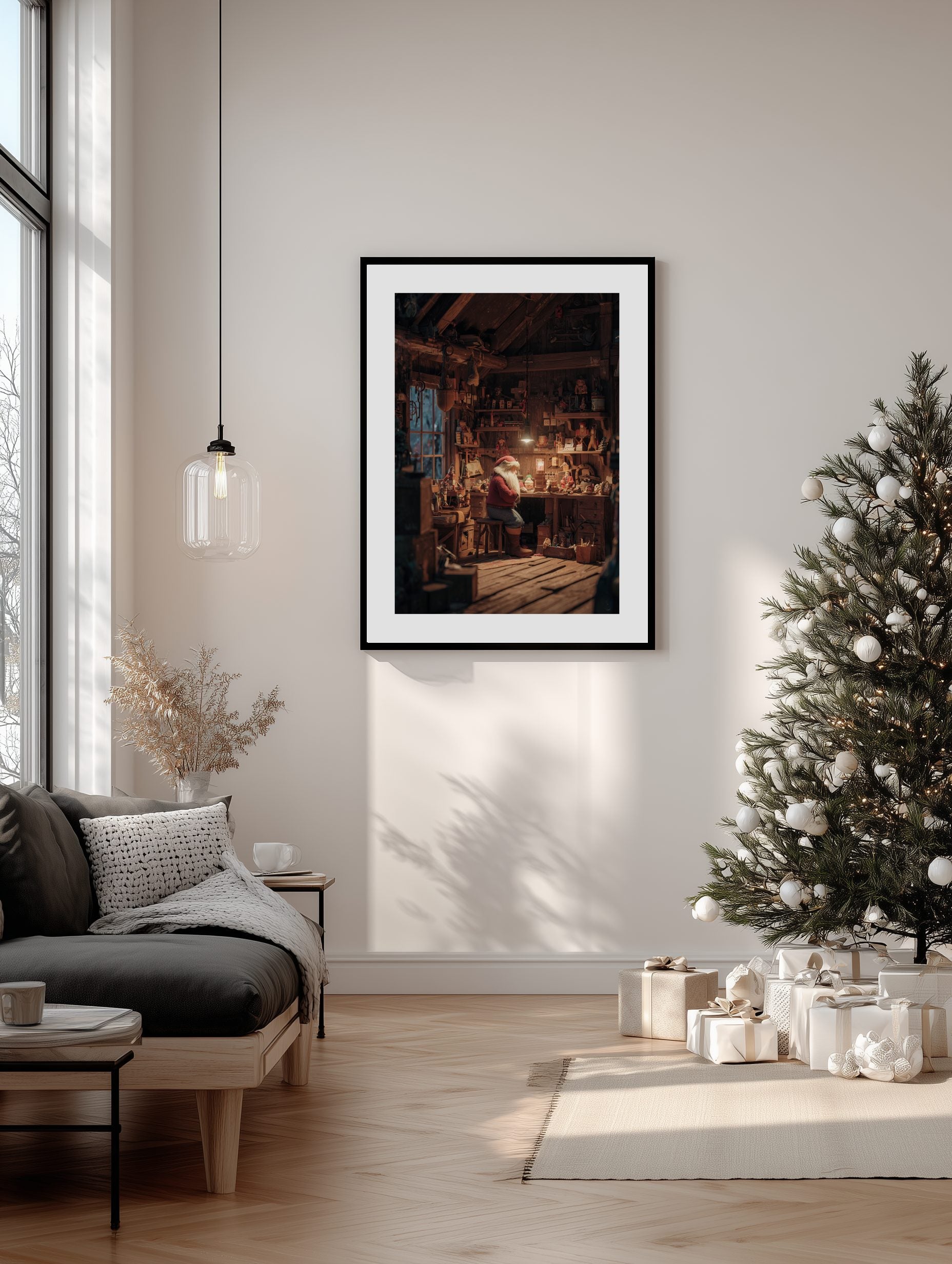 Kliv in i jultomtens magiska verkstad fylld med leksaker, trä och varmt ljus. Detta detaljerade konstverk fångar den hjärtevärmande magin i julhantverket.