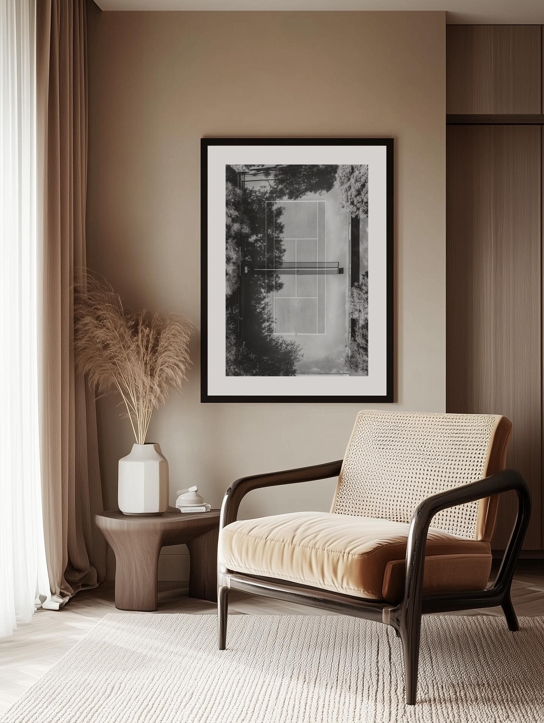 Svartvit flygvy över en ren tennisbana. Perfekt för sportälskare och fans av ren design.