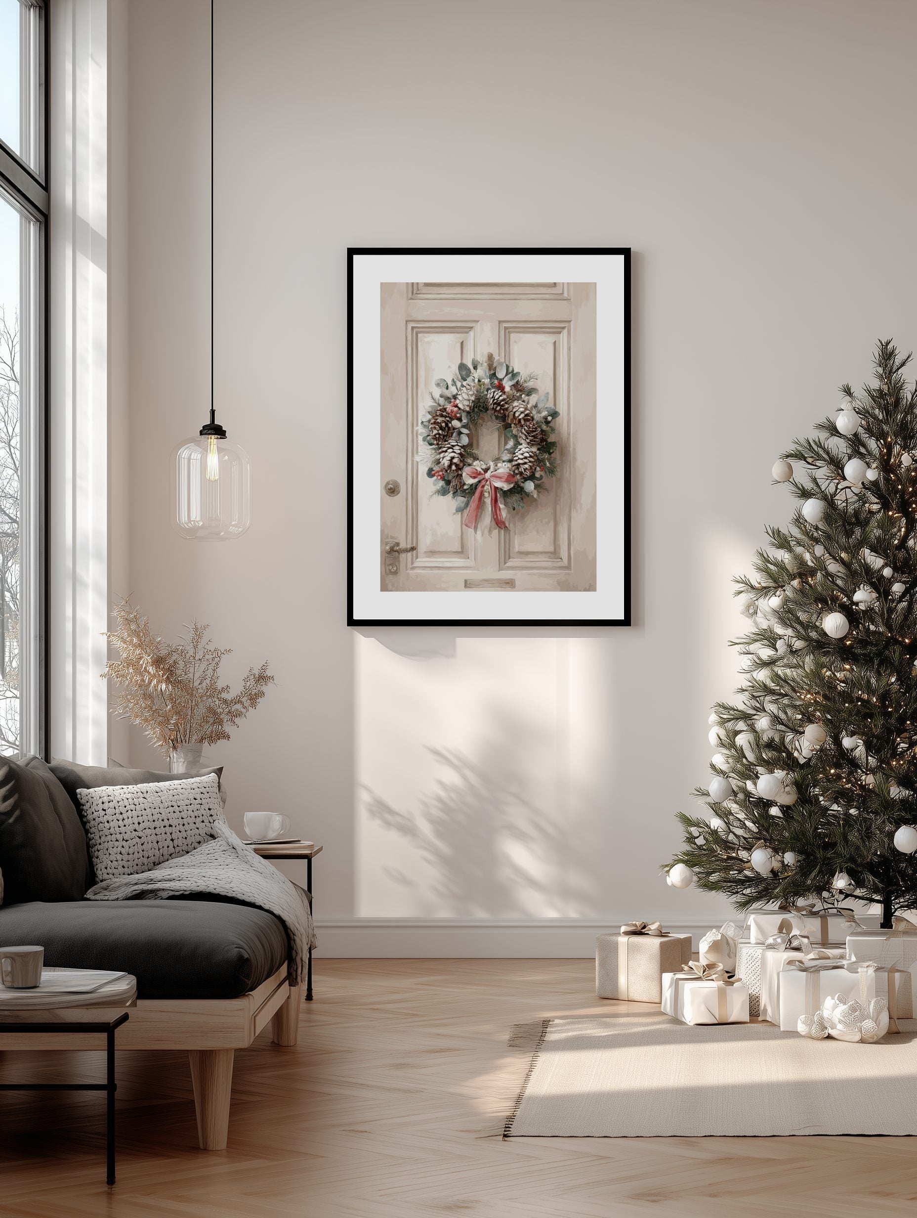 En vackert målad julkrans med kottar, bär och ett rött band på en vintagedörr. Ett tidlöst julkonstverk som ger värme och festlig charm till vilket rum som helst.